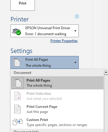 - b Click the Settings (Print all pages) drop down. / Settings (Print all pages) ड्रॉप डाउन पर क्लिक करें।